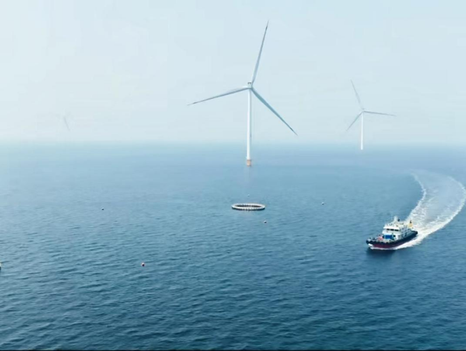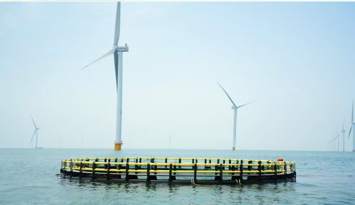 百米高的风机列阵海上,直径近30米的鱼类养殖网箱散落海面。“海上风电+海洋牧场”中, 鱼类养殖网箱、贝藻养殖筏、人工鱼礁,构建修复海洋生物繁殖、生长等场所,既能产生养殖收益,又能获得发电收益。