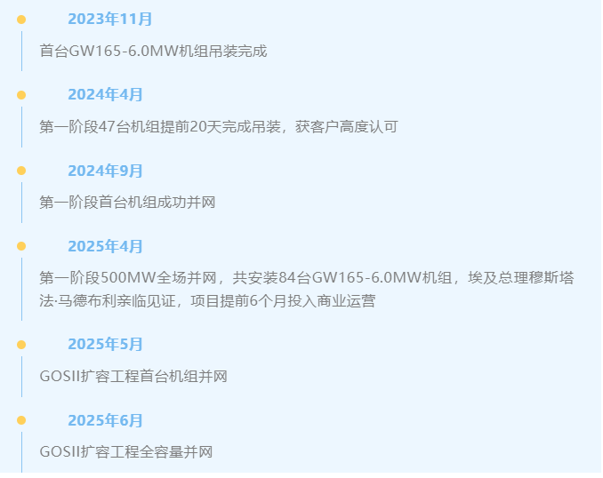 GOSII项目是金风科技在埃及的首个风电项目,自2023年启动以来,在金风科技与产业链伙伴的高效共建下,屡次刷新行业纪录: