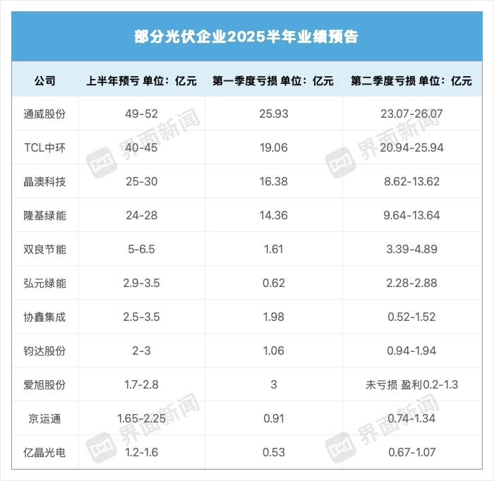 7月14日,多家光伏企业发布2025年半年业绩预告。界面新闻统计了11家主产业链上市公司业绩,它们上半年均陷入亏损,但有四家企业在二季度出现明显转好迹象。