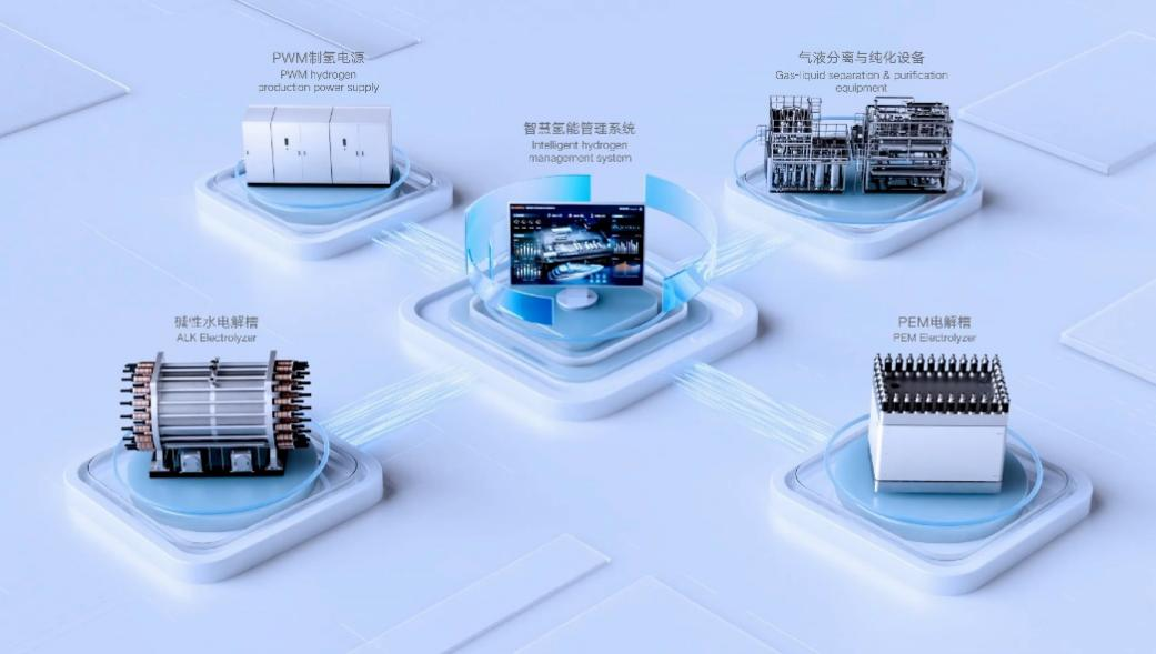 2024年,阳光氢能全球首发300Nm³/h PEM电解槽,突破国内PEM单槽产氢量,多项指标赶超国际水平;同年发布2000+Nm³/h数智化碱性电解槽,在催化剂、电极、流场设计等关键环节取得突破,并搭载数字化管理系统,实现全景监控、安全防控和健康管理,通过传感器、数据采集与智能算法,实现电解槽状态可视化、运行安全与调控优化。数智化电解槽与PWM制氢电源组成"黄金搭档",配合Hybrain智慧氢能管理系统,构建起在深度数智化基础上的柔性制氢系统闭环生态,大大提升了大规模制氢效率及场站安全。