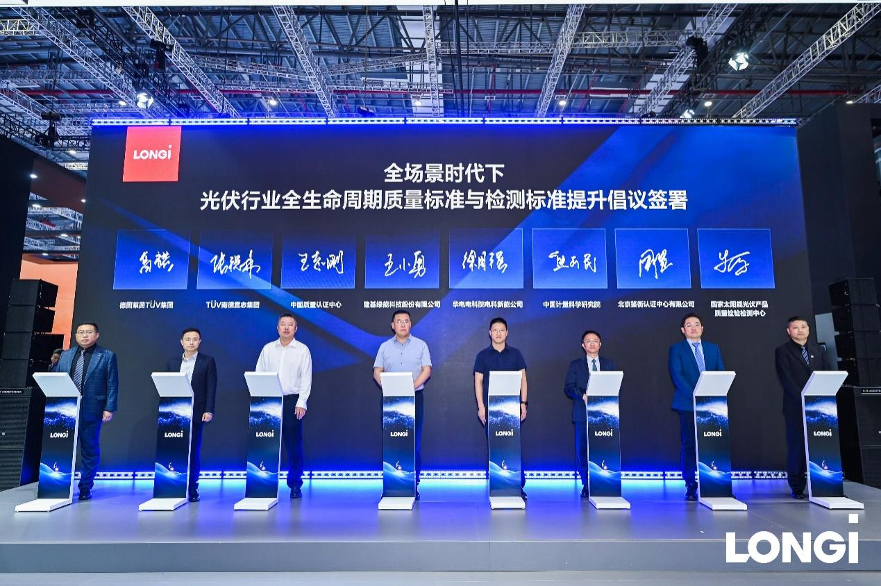 面对国家质监、第三方质检及客户对于组件真实功率、产品高质量的需求,解决光伏乱象,隆基联合中国质量认证中心、中国计量科学研究院、国家太阳能光伏产品质量检验检测中心、德国莱茵TÜV集团、华电电科院电科新能公司等多家中外检验检测机构,共同签署了《全场景时代下,光伏行业全生命周期质量标准与检测标准提升倡议》。
