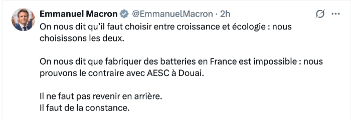 马克龙随后发布推文表示:“有人说,我们必须在经济增长与可持续之间做出选择,但我们选择两者都要;有人说,在法国制造电池是不可能的,远景动力杜埃工厂证明了并非如此。我们不能倒退,我们必须持续坚定的前行。”