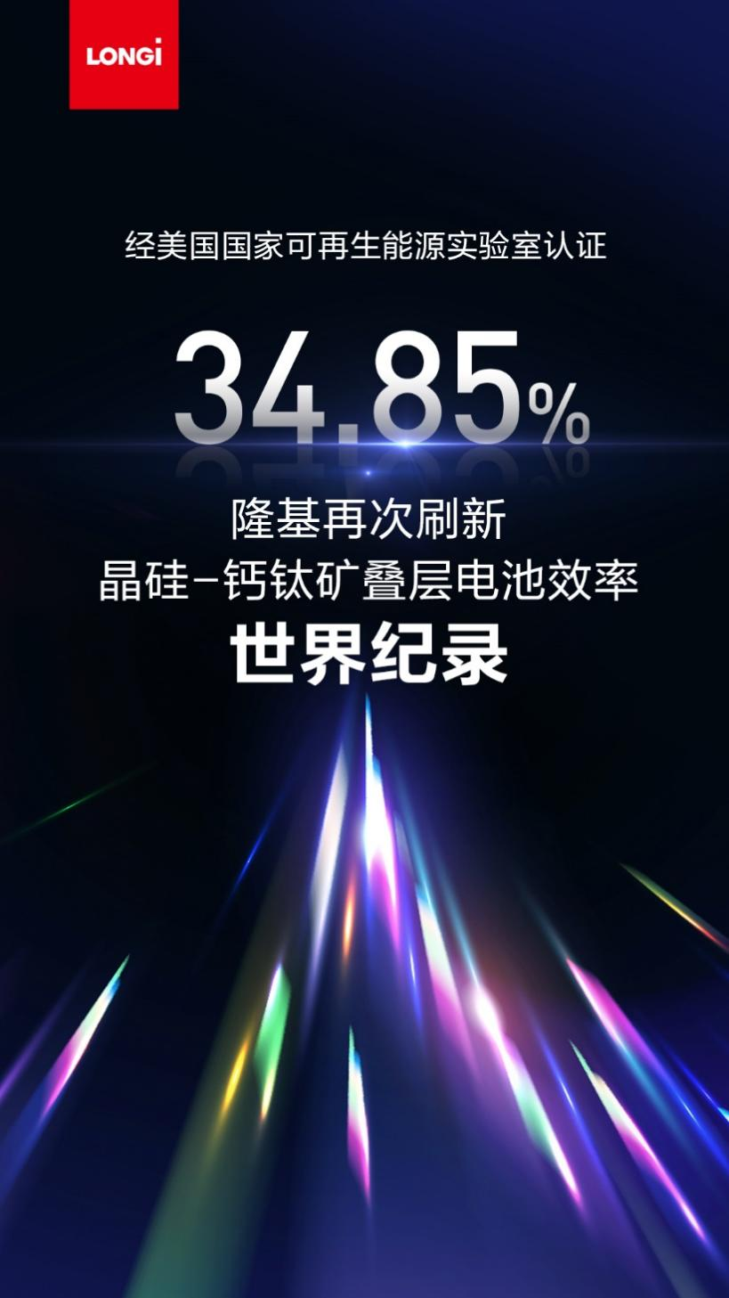 近日,隆基电池研发再次取得重大突破。经美国国家可再生能源实验室(NREL)认证,隆基自主研发的晶硅-钙钛矿两端叠层太阳电池转换效率达到34.85%,再次刷新晶硅-钙钛矿叠层电池效率世界纪录。