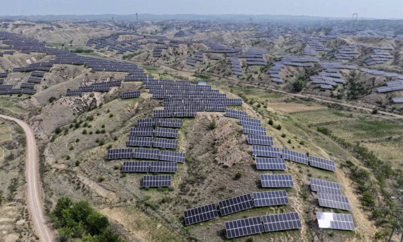 2024年7月11日拍摄的张家口市万全区安家堡乡贾贤庄村附近荒山上的光伏发电场(无人机照片)。新华社记者 杨世尧 摄