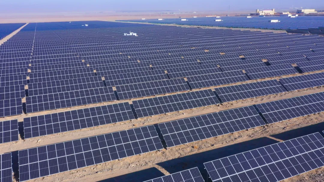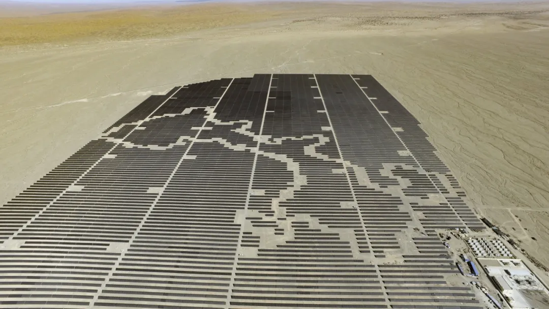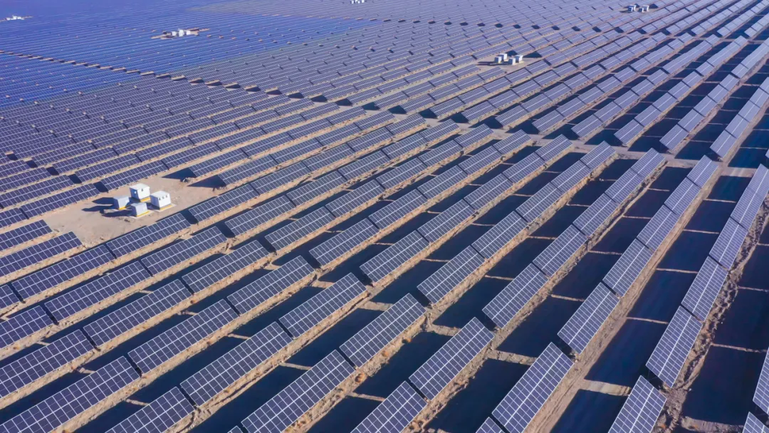 38万块单晶硅太阳能光伏组件在戈壁滩上整齐排列,源源不断地将阳光转化为清洁电能。