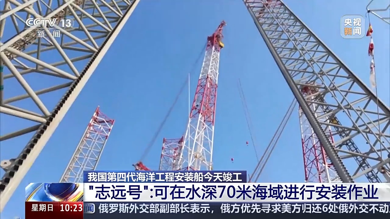 总台央视记者古峻岭介绍,这两艘船是海工装备安装的最佳搭档,它们的本领各有所长。“志高号”的主要功能是吊装和基础打桩,它就像是一个大力水手,有着力大无穷的臂膀。位于船尾红色的巨型桶桩,加上顶部这130米长的臂架就是它的主吊系统。这边巨大的锚状的就是它的主吊钩,它就像是人的抓手,它可以吊起3600吨的货物,这相当于一次性能够吊起2500辆家用轿车。它能够进行360度的旋转,和上一代的海工安装船相比,旋转的速度提升了整整一倍。而且它的精度还非常高,数千吨的货物吊装的精度误差不超过10厘米。