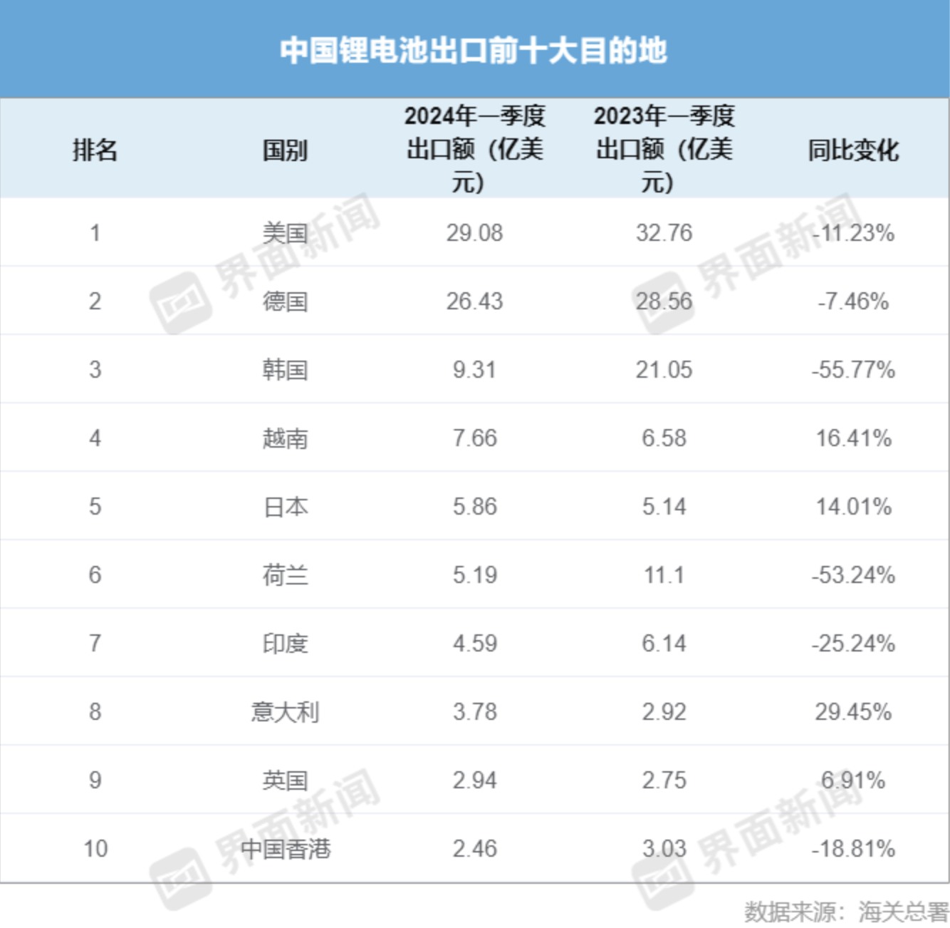 就一季度而言,中国出口至美国的锂电池金额为29.08亿美元(约合210亿元人民币),同比下降11.23%。