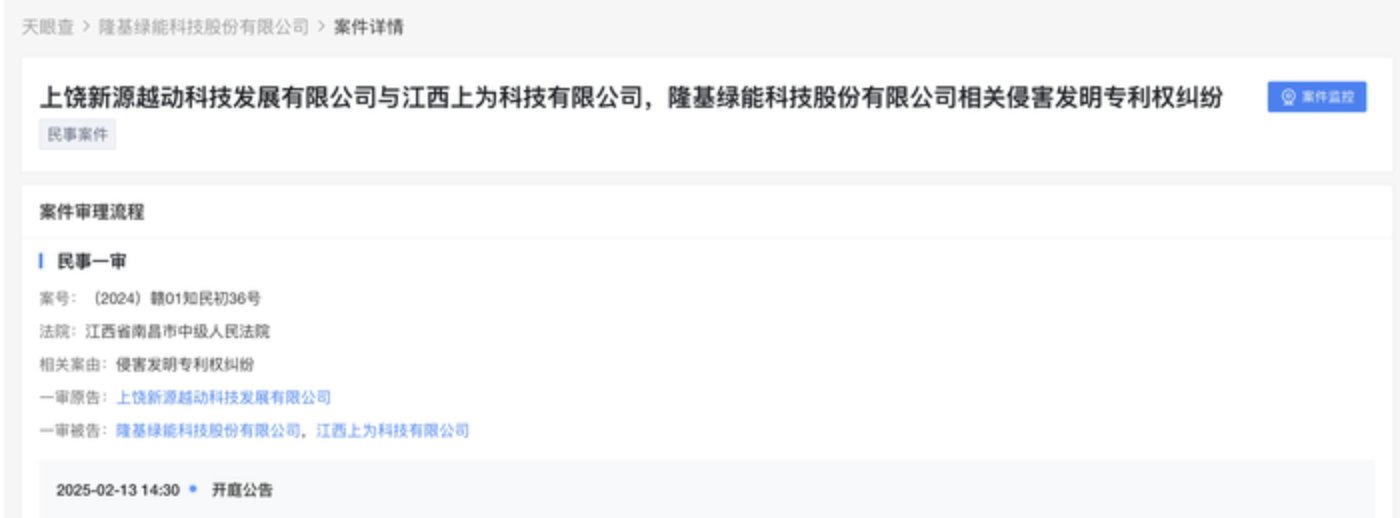 界面新闻自天眼查网站查阅到了上述民事案件,其案号为(2024)赣01知民初36号,一审原告是上饶新源越动科技发展有限公司,被告为隆基绿能、江西上为科技有限公司。该案件将于2月13日下午14:30开庭。