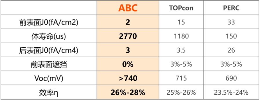 BC技术,即背接触电池技术,是一种将电池的正负两极均放置在电池片背面的技术。这种技术的核心优势在于其正面无栅线的结构设计,可减少电池前表面遮挡,直接消除了传统技术中3%-5%的光照损失,使得电池的转换效率得到显著提升,是N型技术路线中最接近单结晶硅极限转换效率的技术。以爱旭n型ABC技术为例,其电池平均量产效率高达27.2%,已连续20个月霸榜TaiyangNews全球商用组件量产效率排行榜第一。