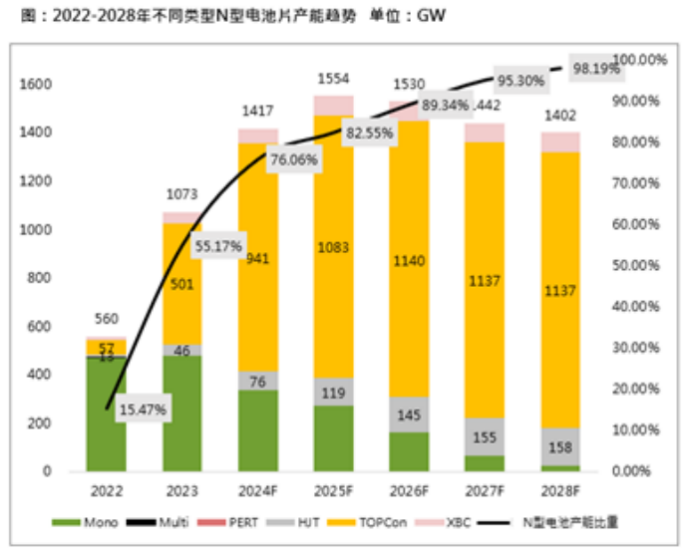 S&P标普全球在其《光伏技术报告》中预测,自2024年起,TOPCon技术将成为光伏行业中应用最广泛的技术路线。相比于众多n型产品,其核心竞争力在于其核心钝化结构技术和较低的迭代成本。