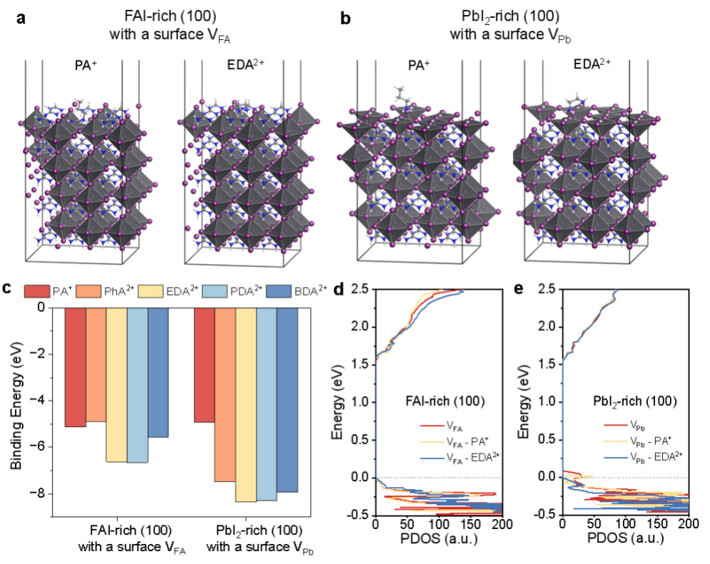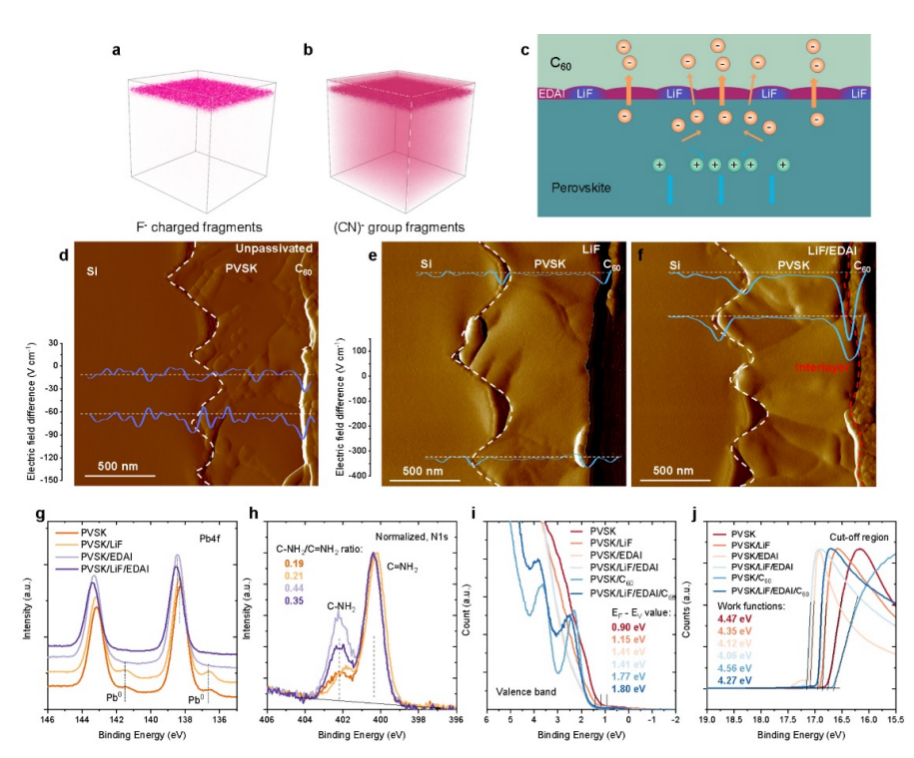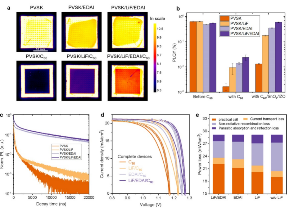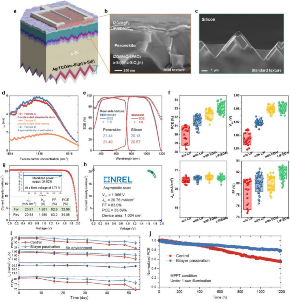 该研究采用双层交错钝化策略,在更加有效抑制钙钛矿界面非辐射复合的同时实现高效电荷传输。另外,为了更好地实现钙钛矿顶电池与晶硅底电池的结构耦合,隆基绿能自主开发了一种非对称绒面的硅异质结太阳电池专利技术。该硅电池的正表面为小微绒面,便于实现钙钛矿的溶液法制备,硅电池背面则采用标准的大尺寸绒面,以实现更好的背面钝化和红外光谱响应。