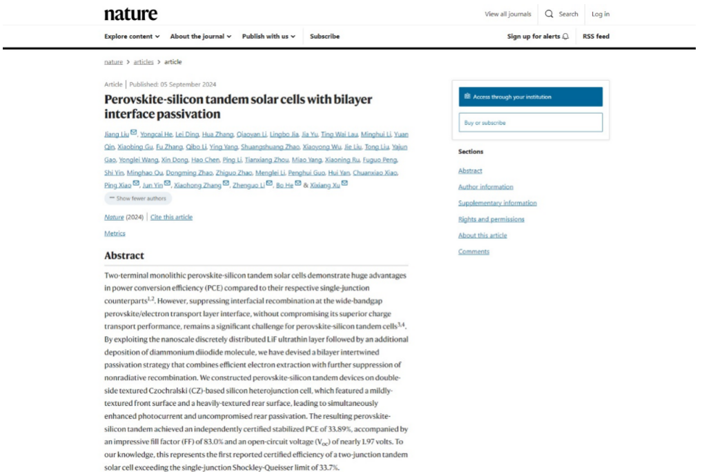 近日,隆基绿能科技股份有限公司(以下简称“隆基绿能”)作为第一单位在《Nature》期刊在线发表了题为“Perovskite-silicon tandem solar cells with bilayer interface passivation”的研究论文,公开报道了通过研制晶硅-钙钛矿双结叠层电池突破单结太阳电池效率极限的研究成果。