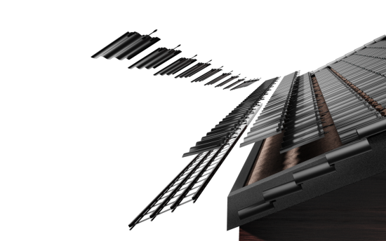 耐用性方面,美学曲面光伏瓦采用4mm超白全钢化玻璃和铝合金构件,能够抵御冰雹冲击,具备TAS100等级的防雨能力,保护屋顶在恶劣天气中不受侵害;能够承受从零下40摄氏度到85摄氏度的温度变化,适应从热带岛屿到极寒地区的各种气候条件。
