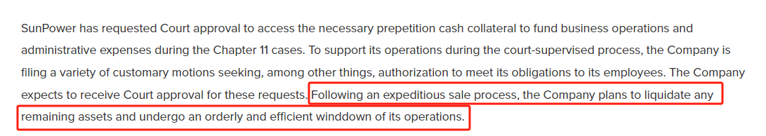 虽然美国《破产法》第11章是破产重组程序,但SunPower在周一的新闻稿中确认,“在加快出售程序之后,公司计划清算所有剩余的资产,并对业务进行有序和高效的清盘。”