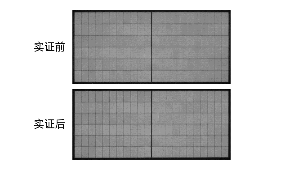 凭借卓越的可靠性和耐寒性,天合光能至尊N型630W系列单玻组件在严酷的低温暴雪环境下表现优异,从众多参与测试的组件中脱颖而出。在漠河最寒冷的冬季运行5个月后,从外观和EL上看,至尊N型630W系列单玻组件边框正常,整体无变形,背板无开裂,黄变等情况,对比运行前后的EL图像更可以清晰看到,几乎没有出现电池片隐裂的现象。此外,从绝缘耐压测试结果来看,在4000V高压脉冲电压下,该组件完美通了过绝缘可靠性测试。