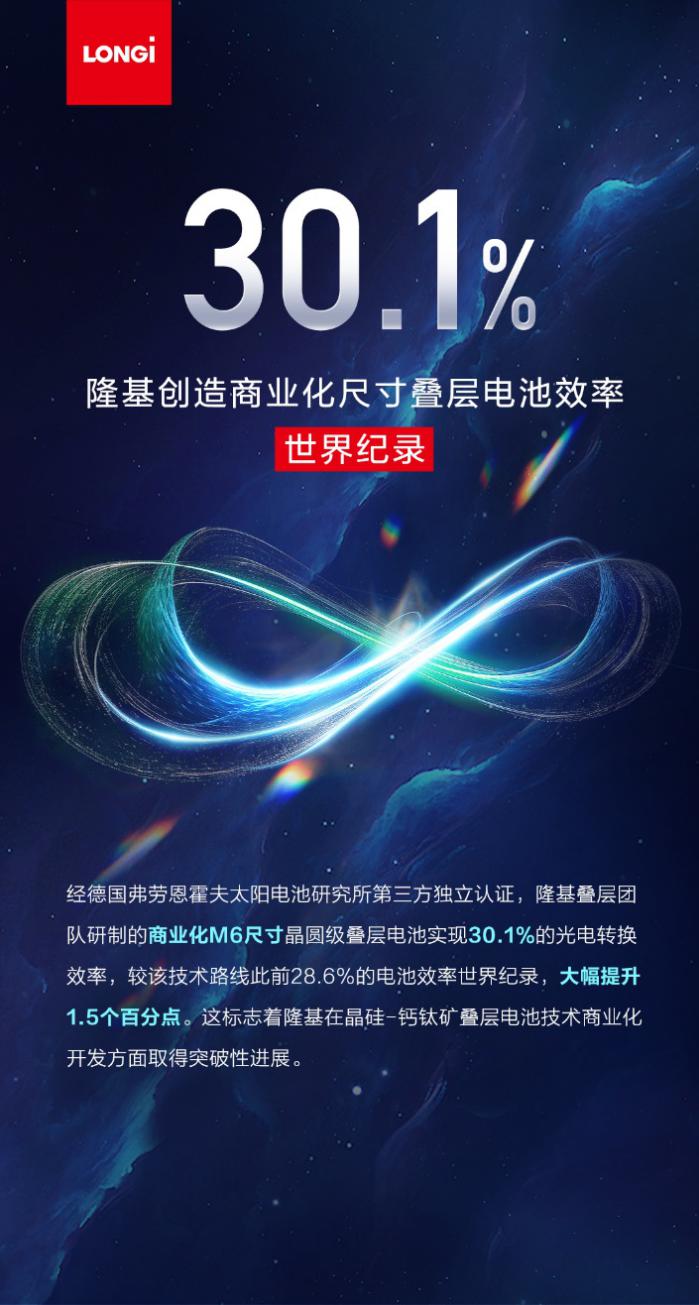 当地时间6月19日,正在德国慕尼黑进行的Intersolar Europe 2024展会上,隆基重磅发布晶硅-钙钛矿叠层太阳能电池领域的研发最新进展。经太阳电池领域权威认证机构德国弗劳恩霍夫太阳电池研究所(Fraunhofer ISE)第三方独立认证,隆基叠层团队研制的商业化M6尺寸晶硅-钙钛矿叠层电池实现30.1%的光电转换效率,较该技术路线此前28.6%的电池效率记录,大幅提升1.5个百分点,标志着隆基在晶硅-钙钛矿叠层电池技术商业化应用方面取得突破性进展。