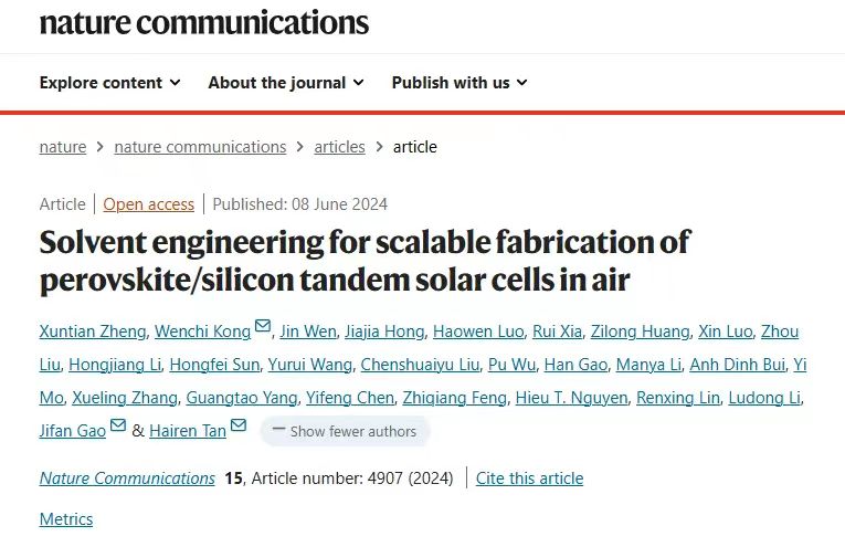 近日,光伏科学与技术全国重点实验室主任高纪凡带领的科研团队与南京大学谭海仁教授团队组成的课题组,在国际顶尖学术期刊《自然通讯》(Nature Communications)(《自然》(Nature)子刊)上发表研究论文,首次提出了一种在空气中可规模化制备钙钛矿/晶体硅叠层太阳电池的溶剂工程方法。