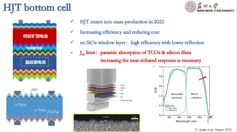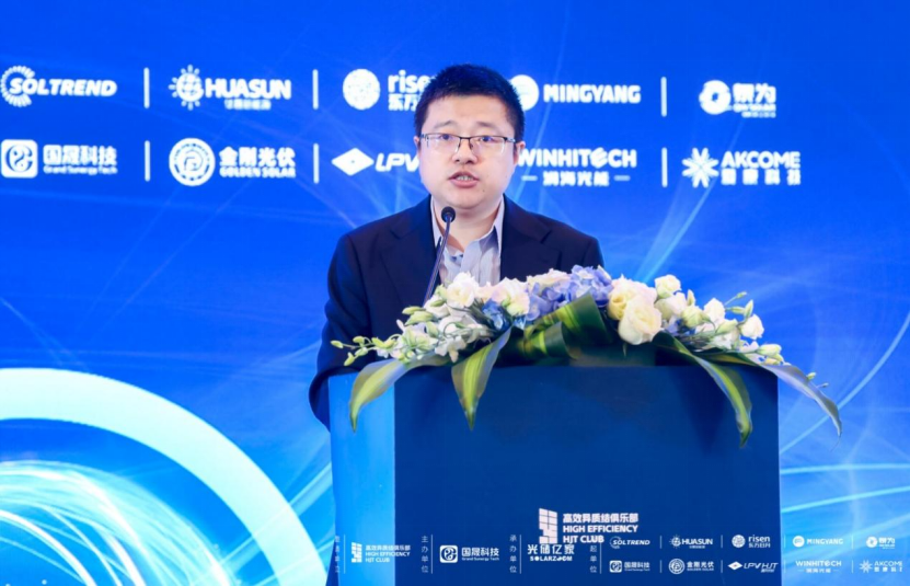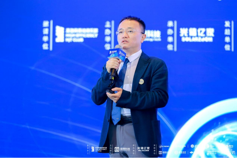 苏州大学能源学院特聘教授、博导、苏州大学-隆基绿能光伏技术联合实验室主任杨新波,做了名为《异质结叠层电池技术进展》的主题演讲。他指出,异质结是很好的基底层,未来HJT-钙钛矿叠层电池的大面积制备,应该横向更高透明度、纵向导电性能好、侧向导电性能弱的方向发展。