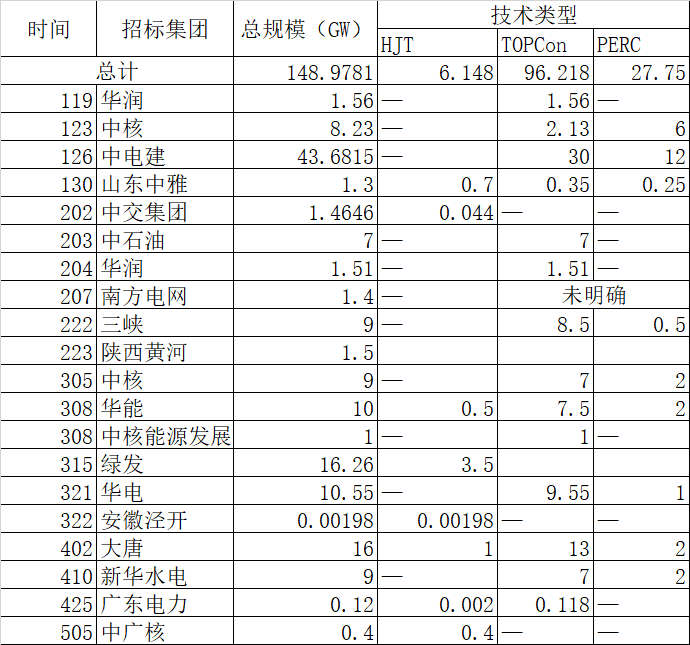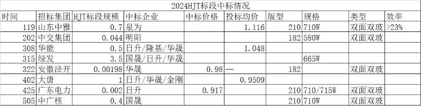 与主流市场不尽相同的是,HJT异质结组件在2024年的上半年迎来了久违的发展机遇和更加严苛的降本挑战。据观察,2024年上半年,在已公告的大型组件集采中,接连不断出现了不少单独的异质结标段以及异质结产品的高价中标案例。在2024年前5个月,SOLARZOOM统计到的148.98GW组件集采项目中,共有8个项目计 6.15GW的HJT异质结组件集中采购项目逐渐明朗:其中包括日升、隆基和华晟中标华能500MW HJT异质结组件项目,国晟、日升和华晟三家中标绿发3.5GW的HJT异质结标段,日升、华晟和金刚中标大唐1GW的HJT异质结组件集采项目,另外泉为科技中标山东中雅700MW异质结采购项目,明阳光伏中标中交集团44MW的分布式光伏项目,东方日升中标广东电力2MW分布式光伏项目,国晟科技中标中广核招远400MW海上光伏项目。
