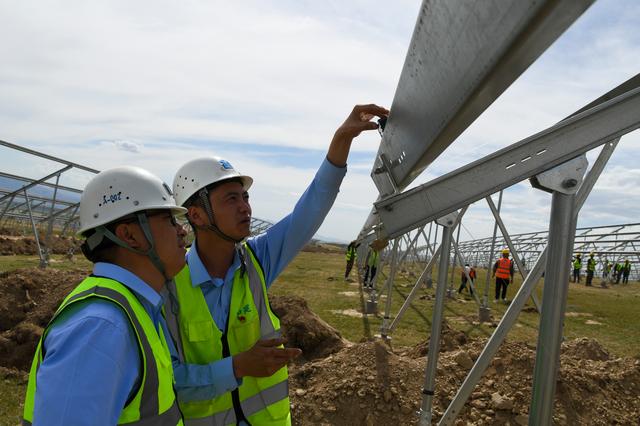 6月11日,在中国绿发尼勒克400万千瓦风电光伏项目一处工地上,中建二局该项目生产经理刘巨龙(右)和项目经理孙浩杰在对安装工艺进行检测。新华社记者 赵戈 摄
