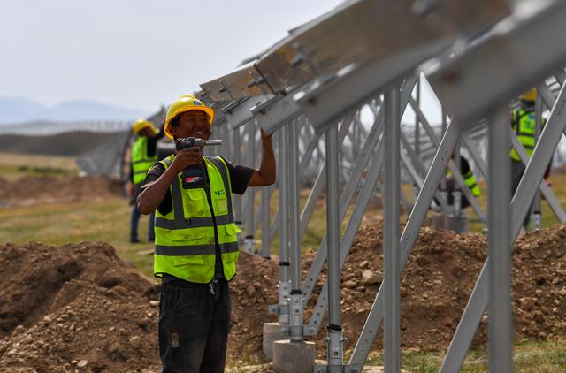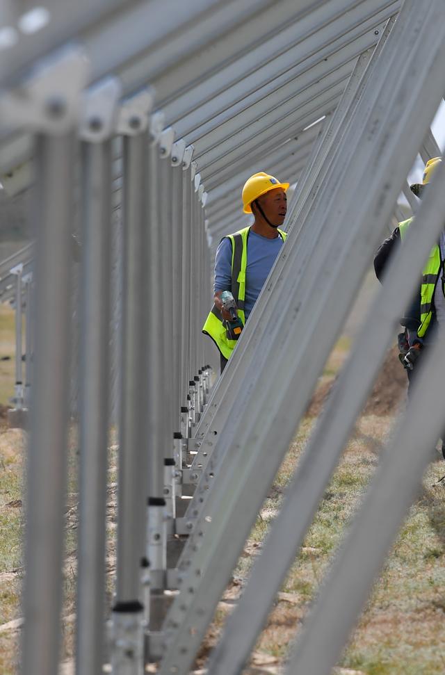 6月11日,在中国绿发尼勒克400万千瓦风电光伏项目一处工地上,中建二局参建人员在安装光伏支架。新华社记者 赵戈 摄