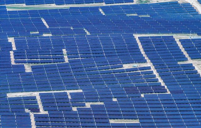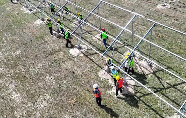 6月11日,中建二局施工人员在安装光伏支架(无人机照片)。新华社记者 赵戈 摄