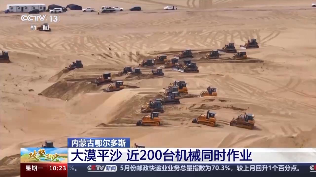 此刻,在我身后,近200台推土机正在这片沙漠上来回穿行,他们要把这些高低起伏、连绵不断的沙丘推平整了,再安装光伏板。这么多推土机具体是如何作业的?技术人员告诉我们,因为地形的原因,今天现场的推平作业大致分为两个梯队:第一梯队负责在沙丘的最上面,把顶部的沙子推下来;第二梯队随后,填平沙坑,平整现场。