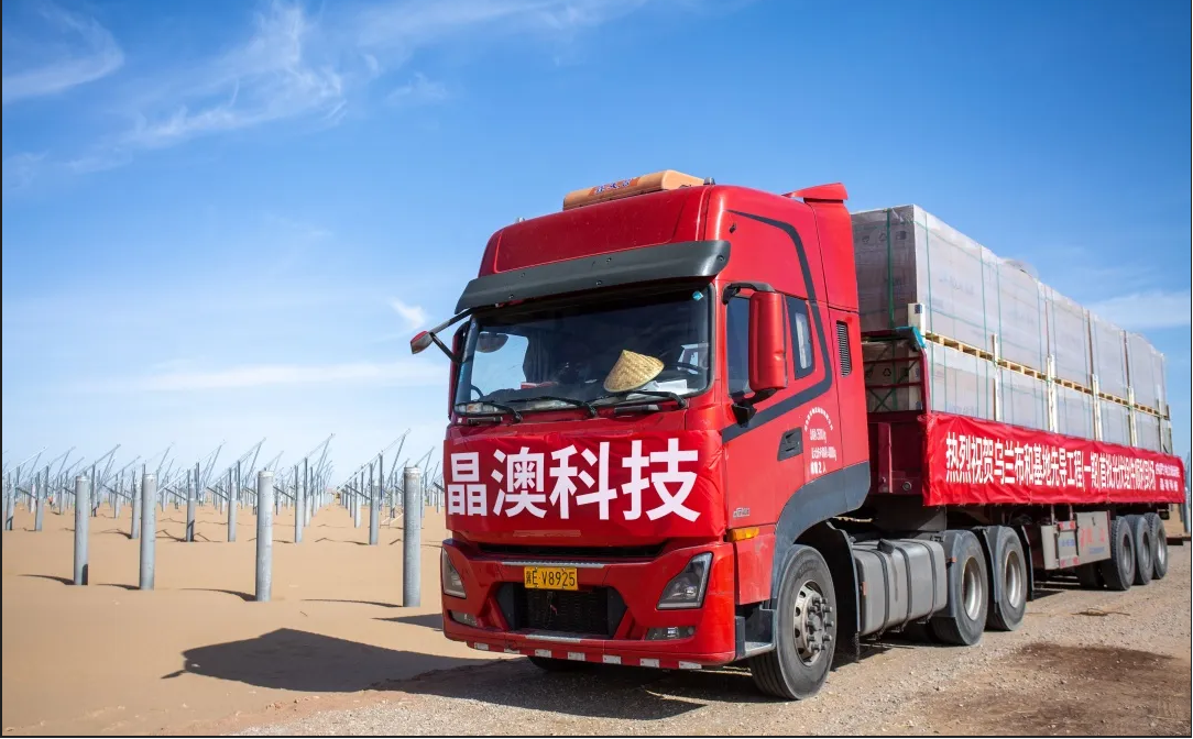 2024年5月31日,巴彦淖尔市磴口县,一辆辆满载晶澳科技n型组件的货车顺利抵达“乌兰布和沙漠东北部新能源基地先导工程100万千瓦光伏发电项目”的现场。这是该项目首批组件到场,预示着乌兰布和沙漠风光大基地的建设已经拉开帷幕,开始提速启航。