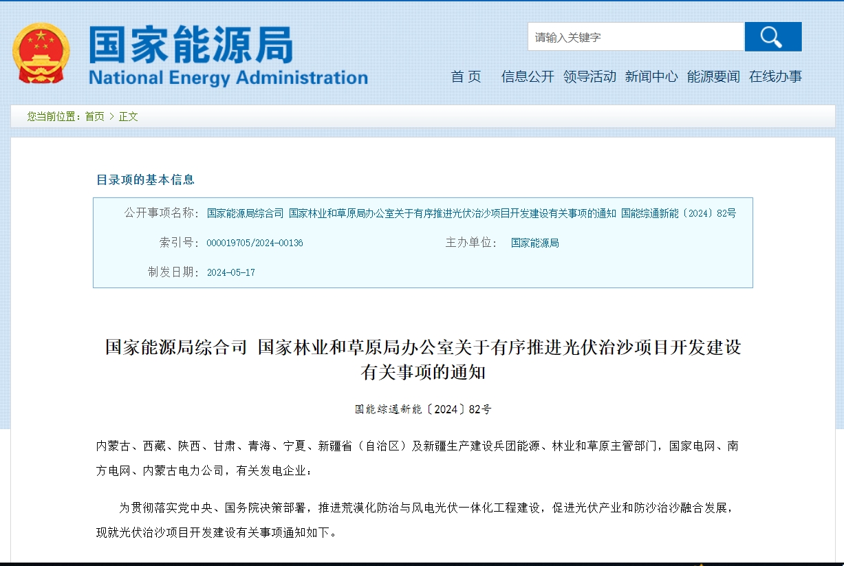 5月27日,据,国家能源局综合司、国家林业和草原局办公室发布关于有序推进光伏治沙项目开发建设有关事项的通知。