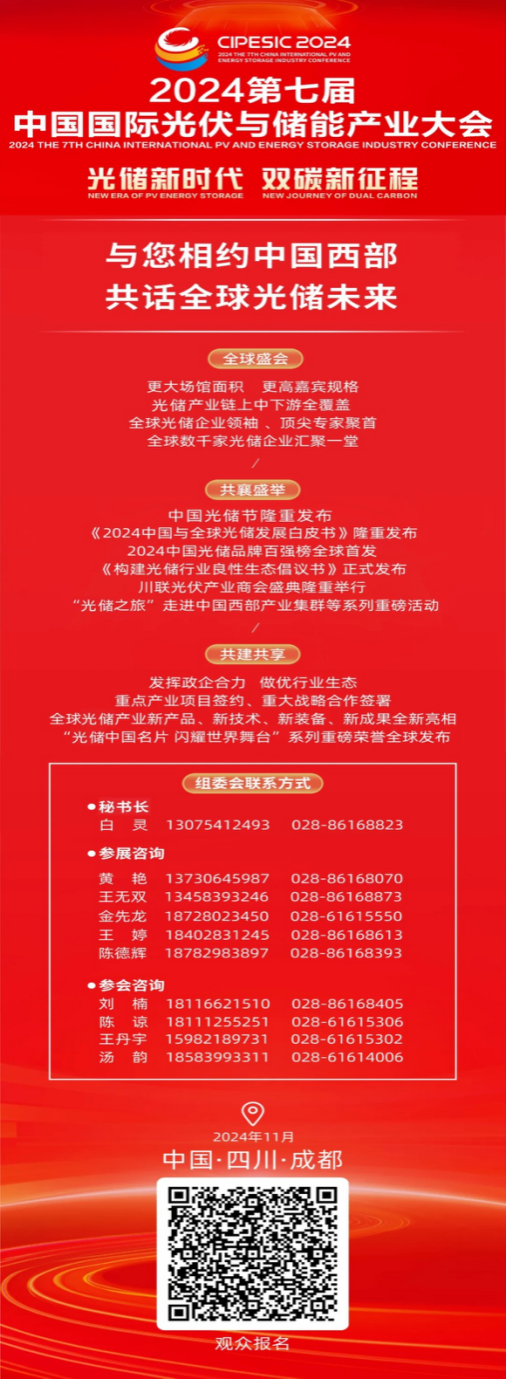 随着绿色低碳发展成为全球共识,光伏产业和新型储能快速发展,并逐渐成为全球能源结构的重要组成部分。今年,中国国际光伏产业大会全新升级为“光储新时代 双碳新征程”2024第七届中国国际光伏与储能产业大会,将于11月在成都隆重举行。届时,海内外重要领导、重磅嘉宾、行业大咖及全球光伏行业龙头企业将汇聚蓉城,以新质生产力推动光伏及储能跨越式发展,赋能全球绿色低碳新未来。