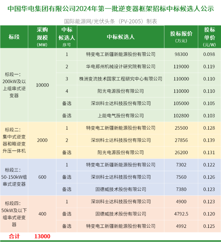 特变电工新疆新能源股份有限公司、深圳科士达科技股份有限公司(备选)、固德威技术股份有限公司(备选)3家企业入围,投标单价范围为0.122—0.126元/W。