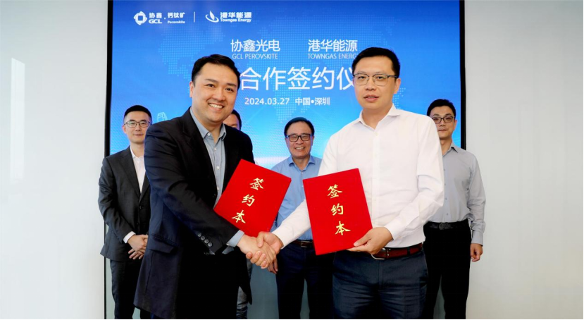 近日,香港中华煤气旗下港华能源投资有限公司与协鑫科技旗下昆山协鑫光电材料有限公司(以下简称“协鑫光电”)达成战略合作,将在今年内共同建设全球首个产业化2平方米尺寸的钙钛矿叠层组件实证示范项目。港华智慧能源执行董事邱建杭博士、协鑫光电董事长范斌等出席签约仪式。