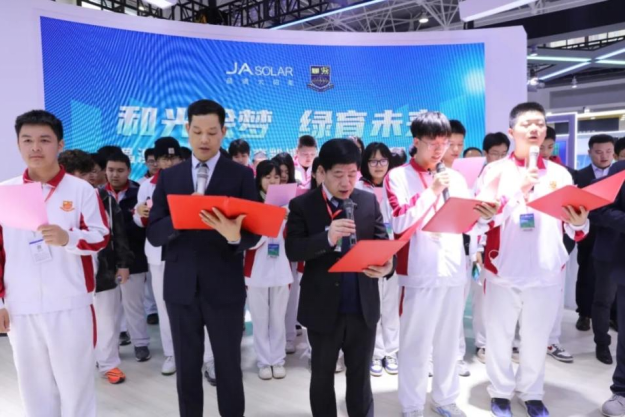 在签订备忘录后,来自晶澳科技与康福国际学校凯博学校的代表共同诵读了《全球绿色工商低碳发展倡议书》,以铿锵有力的声音向全社会传递出双方对清洁能源和可持续发展的坚定信念。