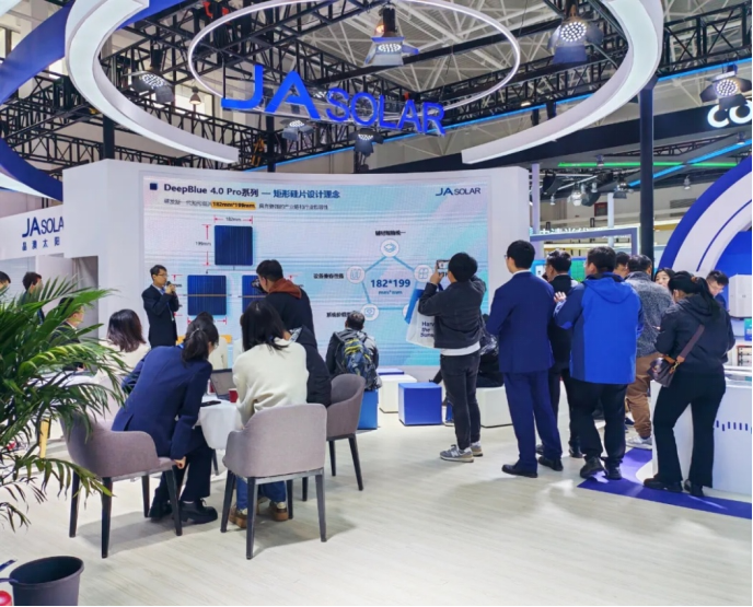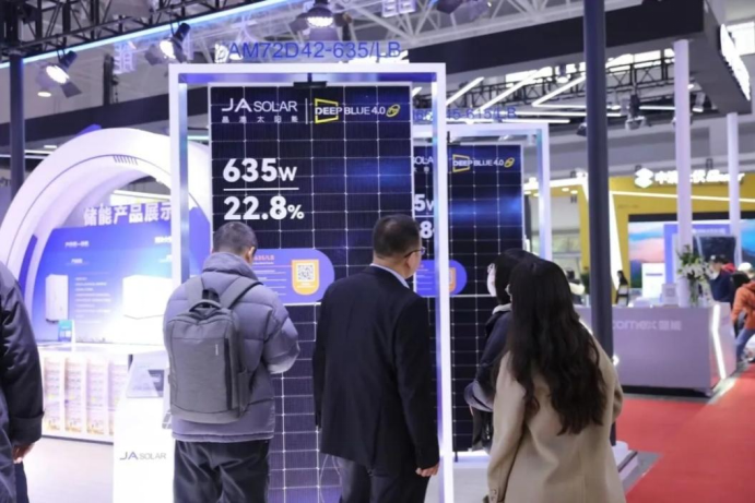 本次展会期间,晶澳科技展出了DeepBlue 4.0 Pro系列产品。DeepBlue 4.0 Pro系列产品采用晶澳科技自主研发的高效n型Bycium+钝化接触电池技术,电池开路电压达到733mV,量产效率达26%。同时,DeepBlue 4.0 Pro组件集成了SMBB技术、高密度封装技术等提质增效核心技术,72版型组件功率可达635W,组件效率达22.8%,是目前行业182系列组件中功率最高的产品。