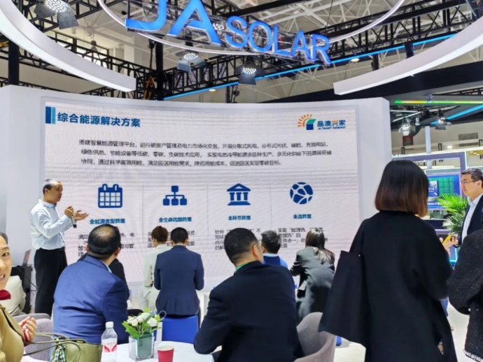 展会现场,晶澳技术人员为参展观众精心讲解了最新光伏组件产品、晶澳兴家五大户用创新方案产品和工商业一体化解决方案。