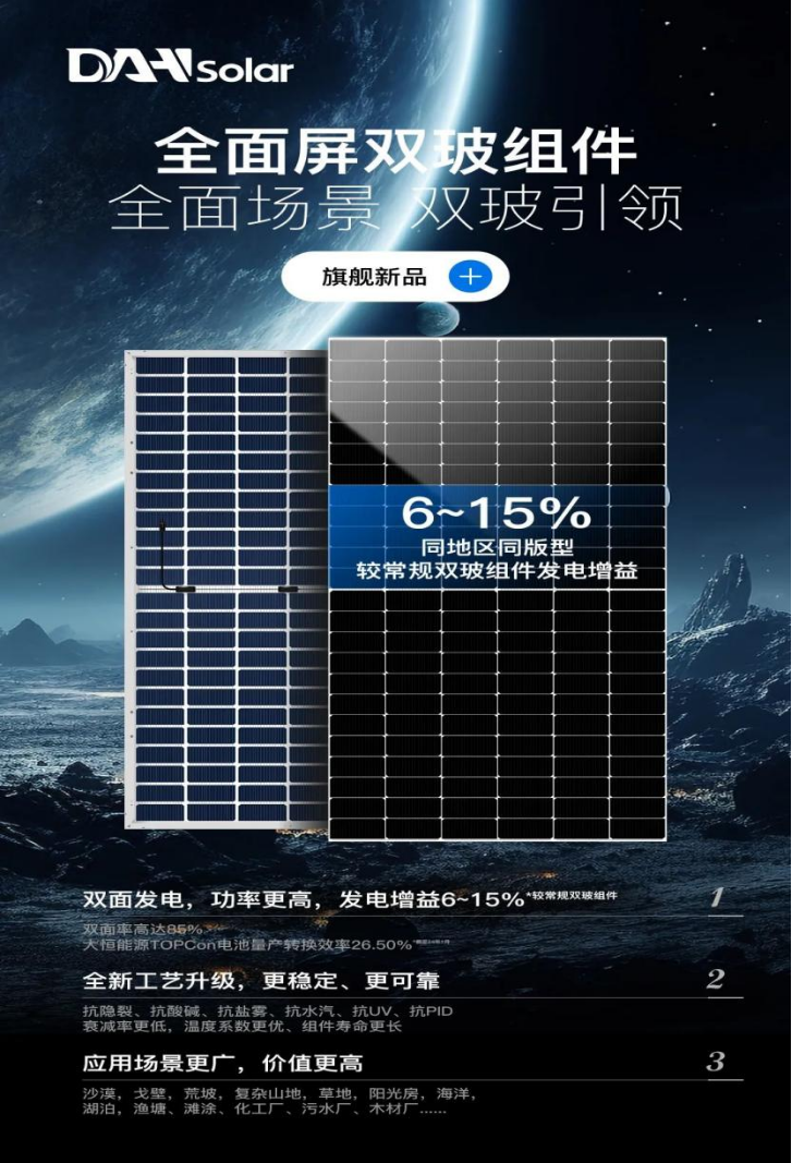 双玻组件在新年伊始就可以预见将引领一轮行业产品新潮。大恒能源全面屏双玻组件不仅具有常规双玻组件0渗水、低衰减、少热斑、效率高、寿命长、机械性能良好、发电稳定可靠等优势,还集成了全面屏技术独特的结构设计与卓越的发电性能,其超高的耐候性与适用性,能够应对99%的特殊与极端应用环境。