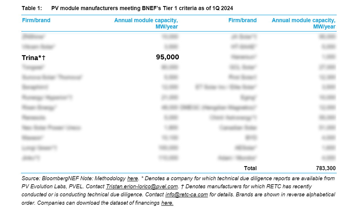 BNEF 2024年第一季度Tier 1光伏组件制造商名录