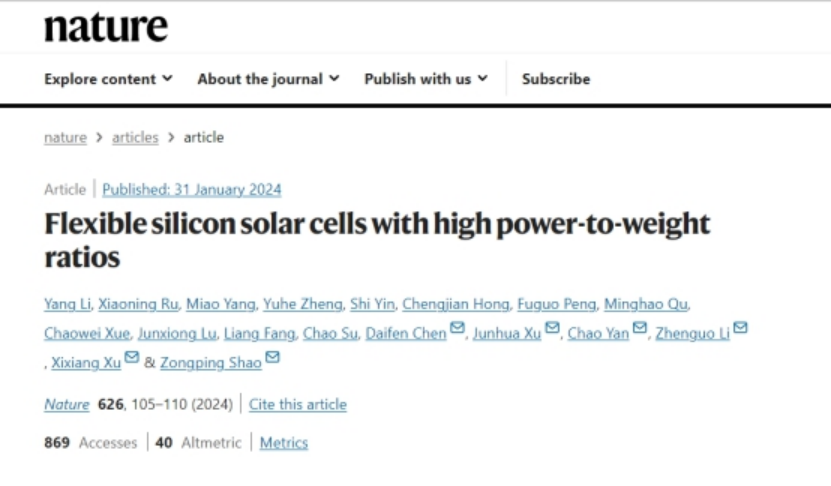 近日,隆基绿能与江苏科技大学、澳大利亚科廷大学三方合作,在国际上首次制造出高柔韧性、高功率重量比的晶硅异质结太阳能电池,相关研究成果以“Flexible silicon solar cells with high power-to-weight ratios”为题发表在国际期刊《Nature》(自然)上。