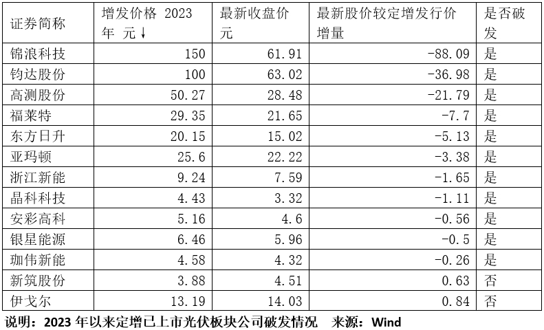 然而,出现定增破发的光伏概念股远不止福莱特这一只,令人惊讶的是,2023年以来定增上市所属上市公司的最新股价较定增发行价未破发的已是���毛麟角。