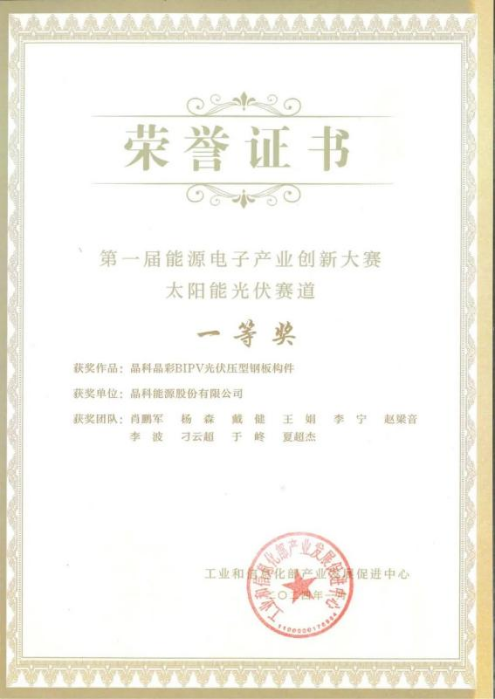 2024年1月3日至5日,工信部产业发展促进中心和四川省宜宾市人民政府共同主办的第一届能源电子产业创新大赛太阳能光伏赛道决赛暨颁奖仪式在宜宾市举办。晶科能源参赛作品晶彩BIPV光伏压型钢板构件产品经过审查、初赛、决赛层层角逐,在174件作品中脱颖而出,荣获太阳能光伏赛道创新应用类一等奖。
