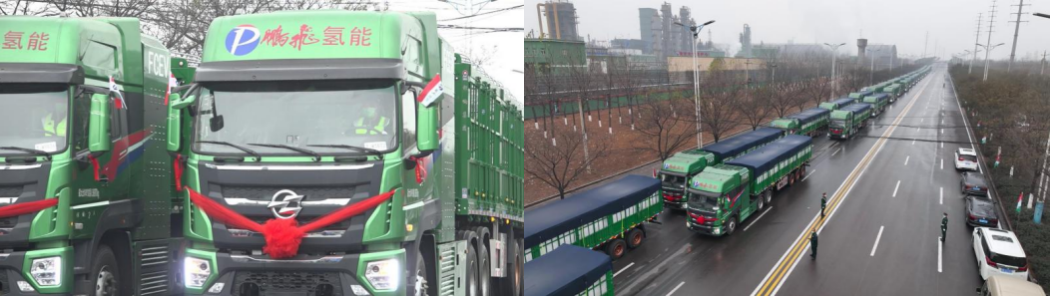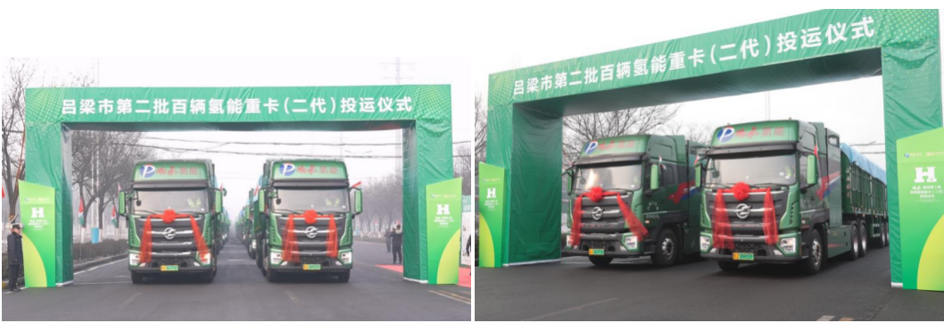 目前,已投运的830辆氢能源车辆,包含氢能重卡、氢能中巴、氢能大巴、氢能装载机、氢能共享单车等,可满足货流和人流需求,300台氢能重卡可达省内五个地级市,省外可达陕西榆林及天津港口,行驶里程逾4200万公里,已累积减碳2.8万吨。