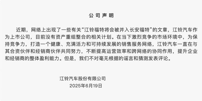 6月19日凌晨,针对近期市场上 “江铃福特将并入长安福特” 的传闻,江铃汽车发布声明称,作为上市公司,江铃汽车目前没有资产重组整合的相关计划。