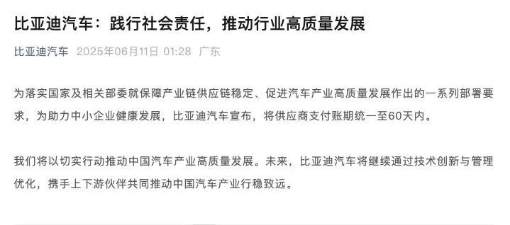 6月11日凌晨1时28分,比亚迪汽车通过官方微信宣布,将供应商支付账期统一至60天内。