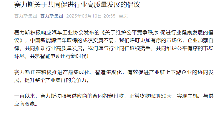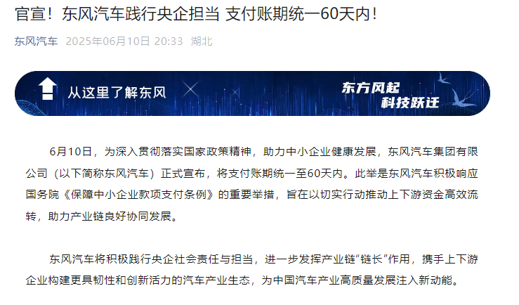 6月10日晚,东风汽车、广汽集团、中国一汽、赛力斯等多家车企分别发表声明,就“支付账期不超过60天”作出承诺。