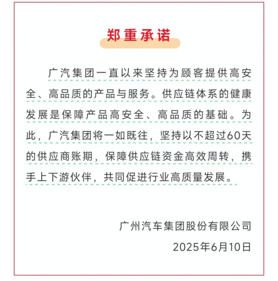 同一天,广汽集团发布关于供应商账期的郑重承诺称:“供应链体系的健康发展是保障产品高安全、高品质的基础。为此,广汽集团将一如既往,坚持以不超过60天的供应商账期,保障供应链资金高效周转,携手上下游伙伴,共同促进行业高质量发展。”