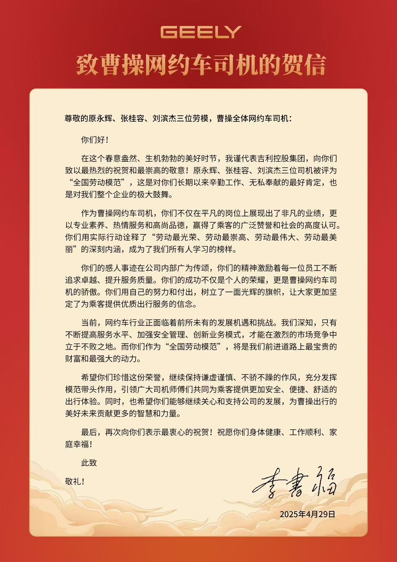 吉利控股集团董事长李书福,向三位荣获“全国劳动模范”称号的曹操司机发出贺信,号召全体吉利人向他们学习,不断追求卓越,为用户提供更优质的服务。