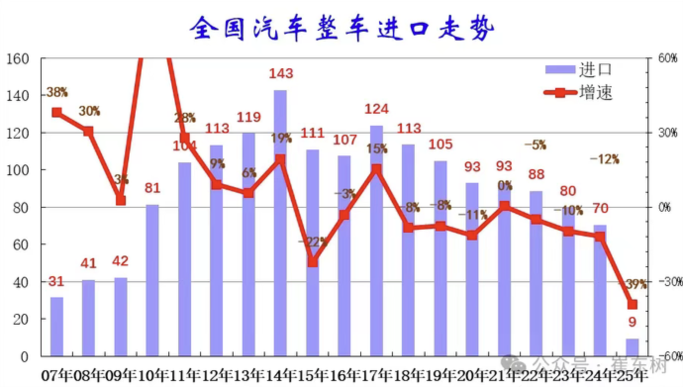 数据显示,中国进口车进口量从2017年的124万辆持续以年均8%左右下行,到2023年仅有80万辆。2024年汽车进口70万辆,同比下降12%。今年一季度,进口降幅进一步扩大。