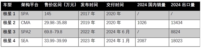 成立8年时间,极星汽车共对外发售四款车型,但每款产品的定位和架构平台都不相同。首款车型极星1定位高性能插电混合动力轿跑,售价高达145万元,全球每年限定500辆。而随后推出的极星2却将起售价直降120万元,转向主流大众市场,以寻求销量规模增长。