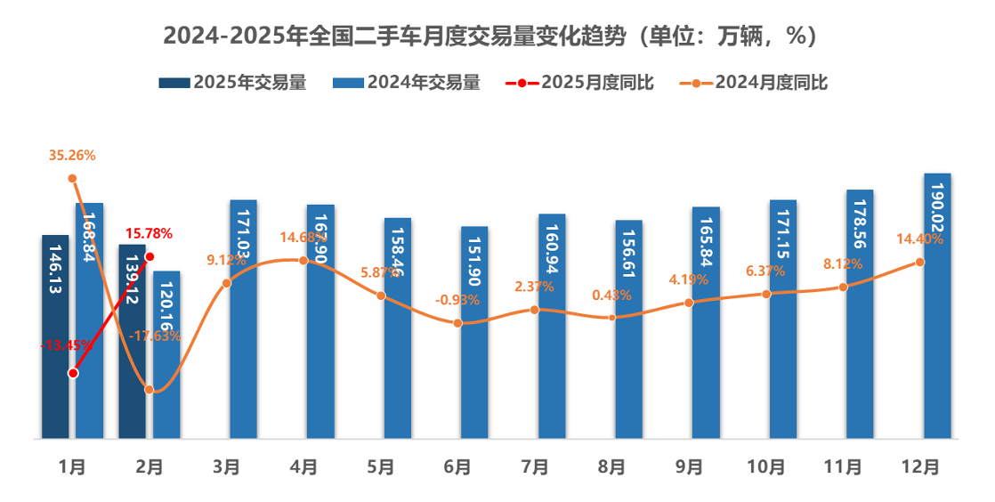 2025年2月,全国二手车市场交易量139.12万辆,环比下降4.79%,同比增长15.78%,交易金额为898.58亿元。中国汽车流通协会信息部副主任陆广智表示,2025年1-2月,二手车累计交易量285.25万辆,同比下降1.3%,与同期相比减少了3.75万辆,累计交易金额为1862.21亿元。