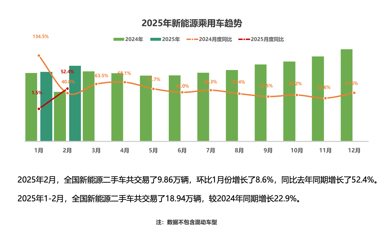 2025年2月,全国新能源二手车共交易了9.86万辆,环比1月份增长了8.6%,同比去年同期增长了52.4%。